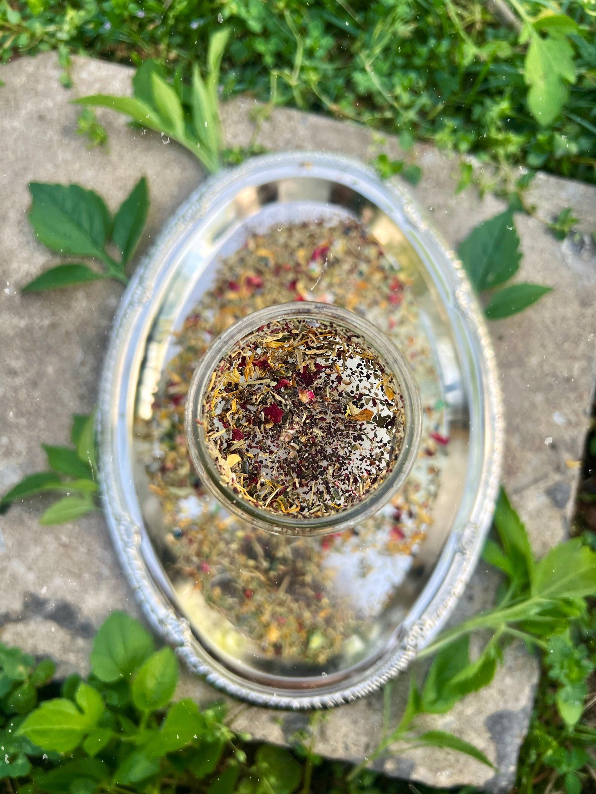 The surface is dressed with a blend of sacred botanicals: